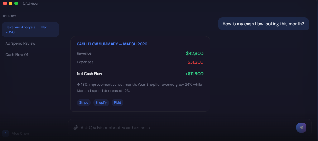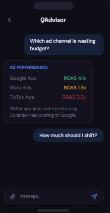Connect your business tools. Ask natural questions. Get strategic insight across finances, revenue, ads, and operations — all in one conversation.